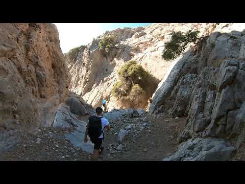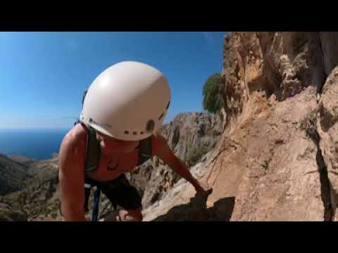 Am Anfang der Route läuft man ca. 10 Minuten einen Pfad entlang zum Beginn einer Schlucht, in die man von oben einsteigt und zunächst nach unten läuft mit kurzen, einfachen Kletterpassagen. Nach ca. 200 Meter weitet sich die Schlucht etwas und man sieht zur Linken eine Felsnadel. Diese Felsnadel muss man von der rechten Seite aus übersteigen. Aber Achtung, die Tritte und das Seil des Klettersteiges sind von untern aus der Schlucht nicht leicht zu finden bzw. sehen. Auf dem Foto sieht man das Seil und die Tritte rechts der Felsnadel, dort müsst ihr hoch. Man sieht zwar von unten zur Linken der Felsnadel ein Seil, das waagerecht über einen kleinen Felskamm zur Felsnadel verläuft, dass ist aber die Versicherung von der Felsnadel weg, wenn man diese überstiegen hat. Also nicht das Geröllfeld hoch laufen!